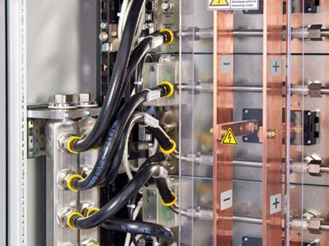 Close-up of the water distribution of a cabinet with eight units and water cooling (240 kW system), DC bus