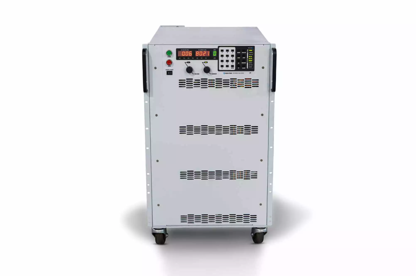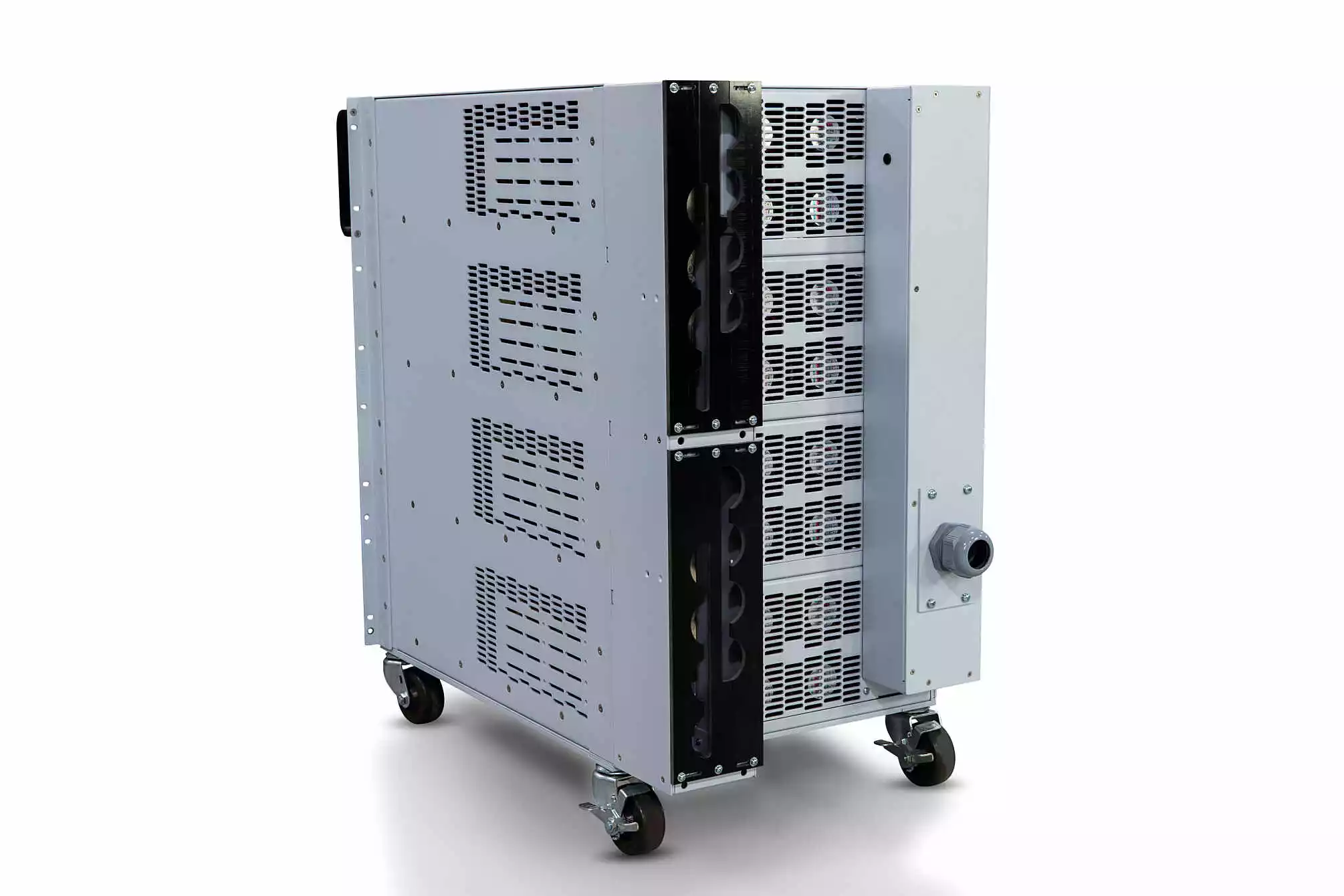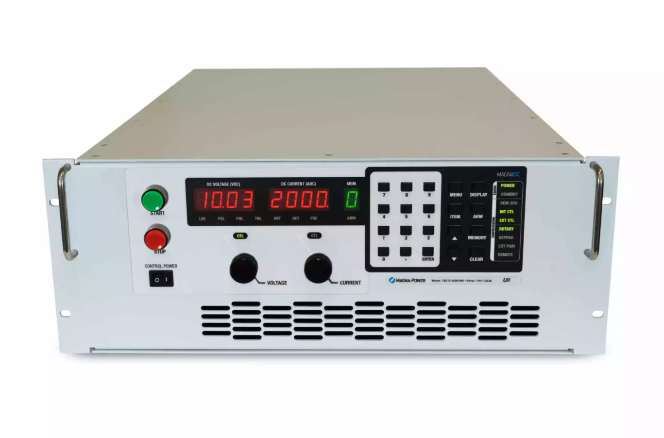 The TS Series offers many models spanning a wide voltage and current range, while still maintaining among the highest power density rack-mount packaging. The TS Series covers voltages from 5 Vdc up to 6000 Vdc (floating) and current levels from 1.2 Adc up to 8000 Adc. Models 5 kW to 15 kW are available in a 3U chassis, models 20 kW and 25 kW are available in a 4U chassis, models 30 kW are available in a 6U chassis, models 40 kW and 50 kW are available in an 8U chassis with removable casters, models 75 kW models are available in a 12U chassis with removable casters, and 100 kW models are available in a 16U chassis with removable casters. In addition, there are several special low voltage high current models, enabling a more cost-effective solution for these requirements. All TS Series power supplies come standard with isolated 37-pin external I/O, RS232, Remote Interface Software, IVI drivers, and LabVIEW drivers for integration into a variety of programming environment.